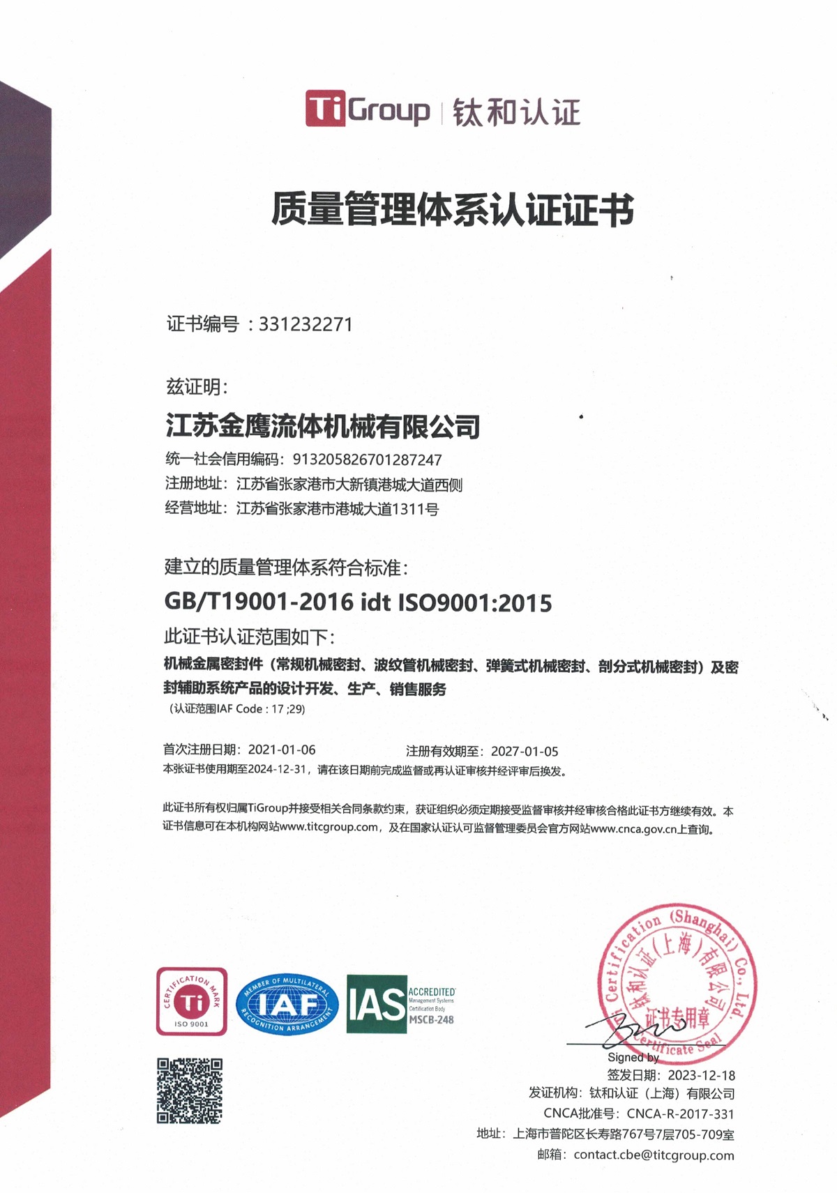 質量管理體系認證證書(英文版)