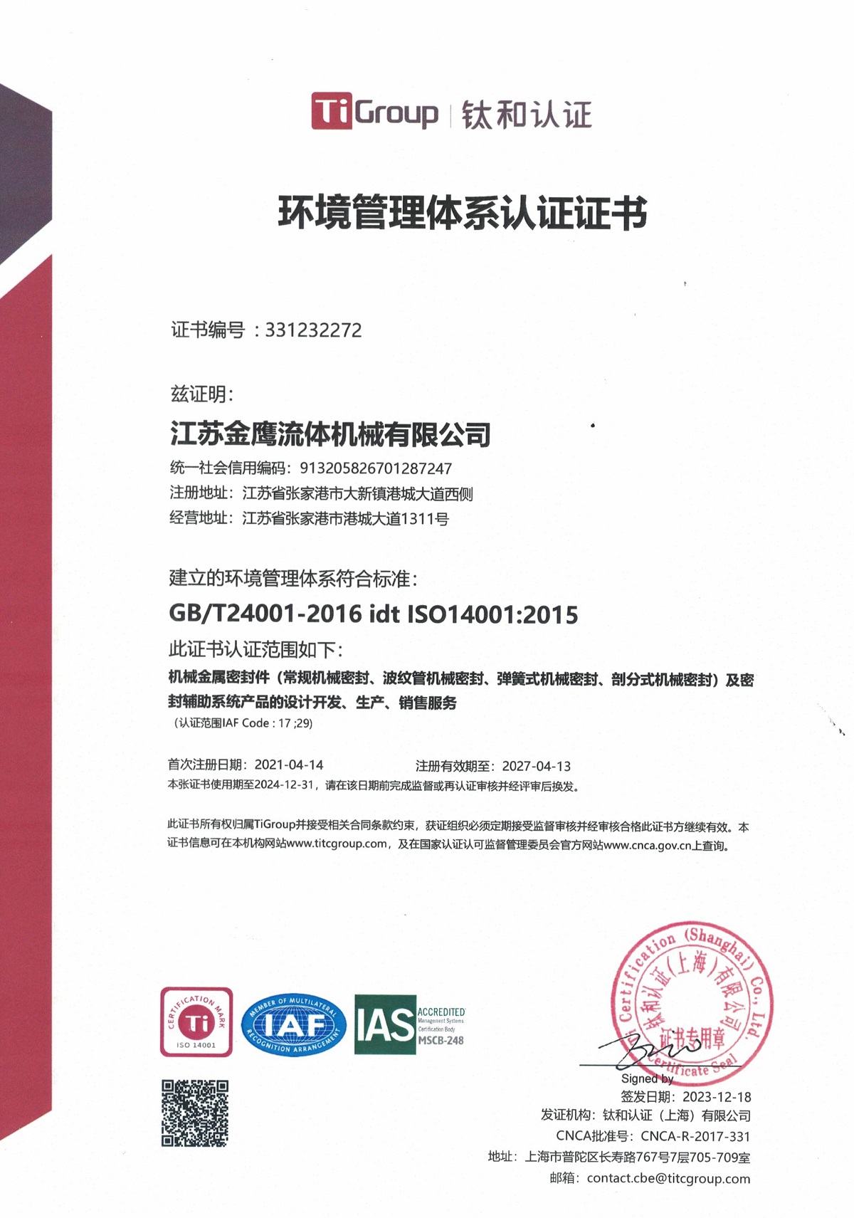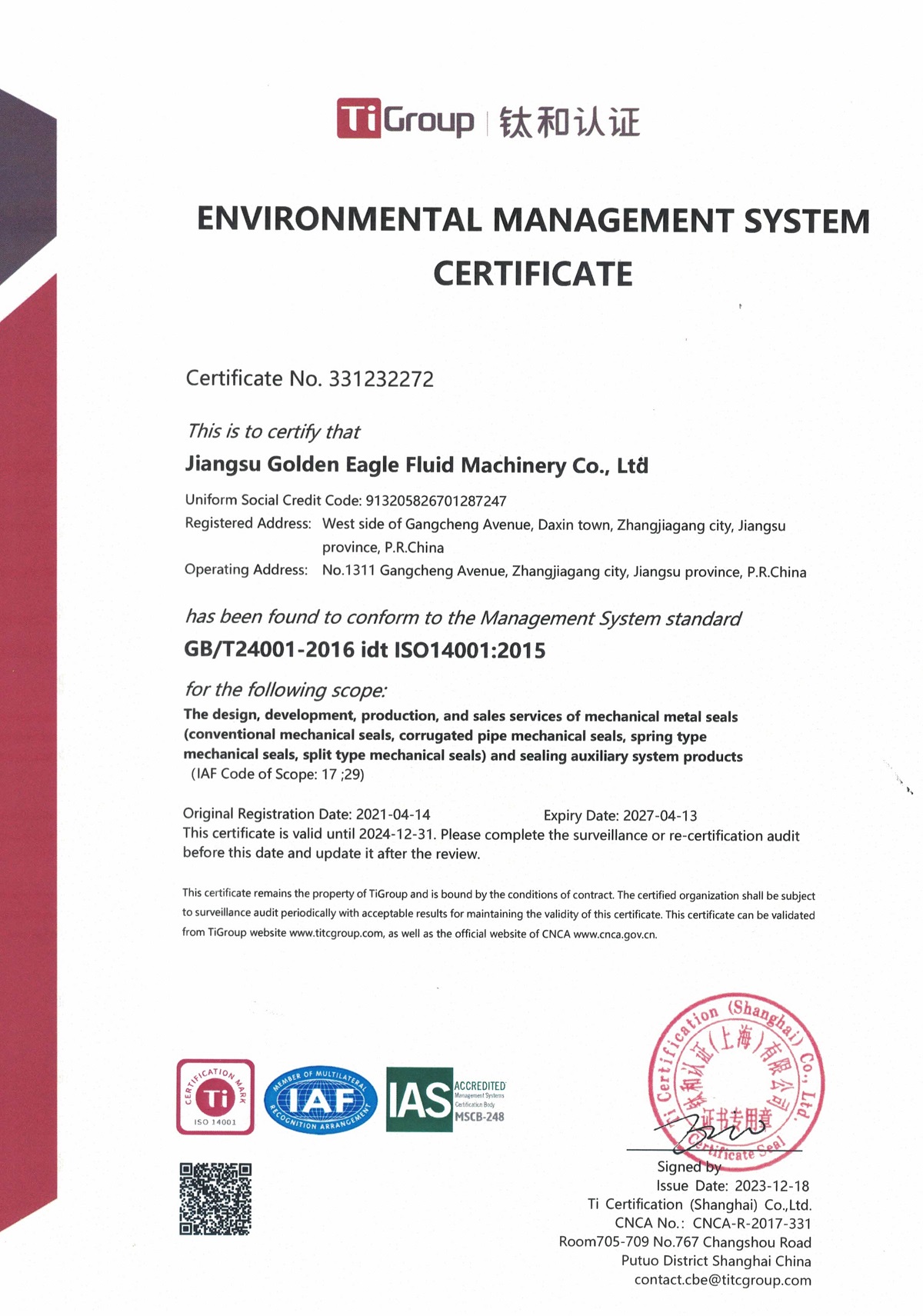 環境管理體系認證證書(英文版)
