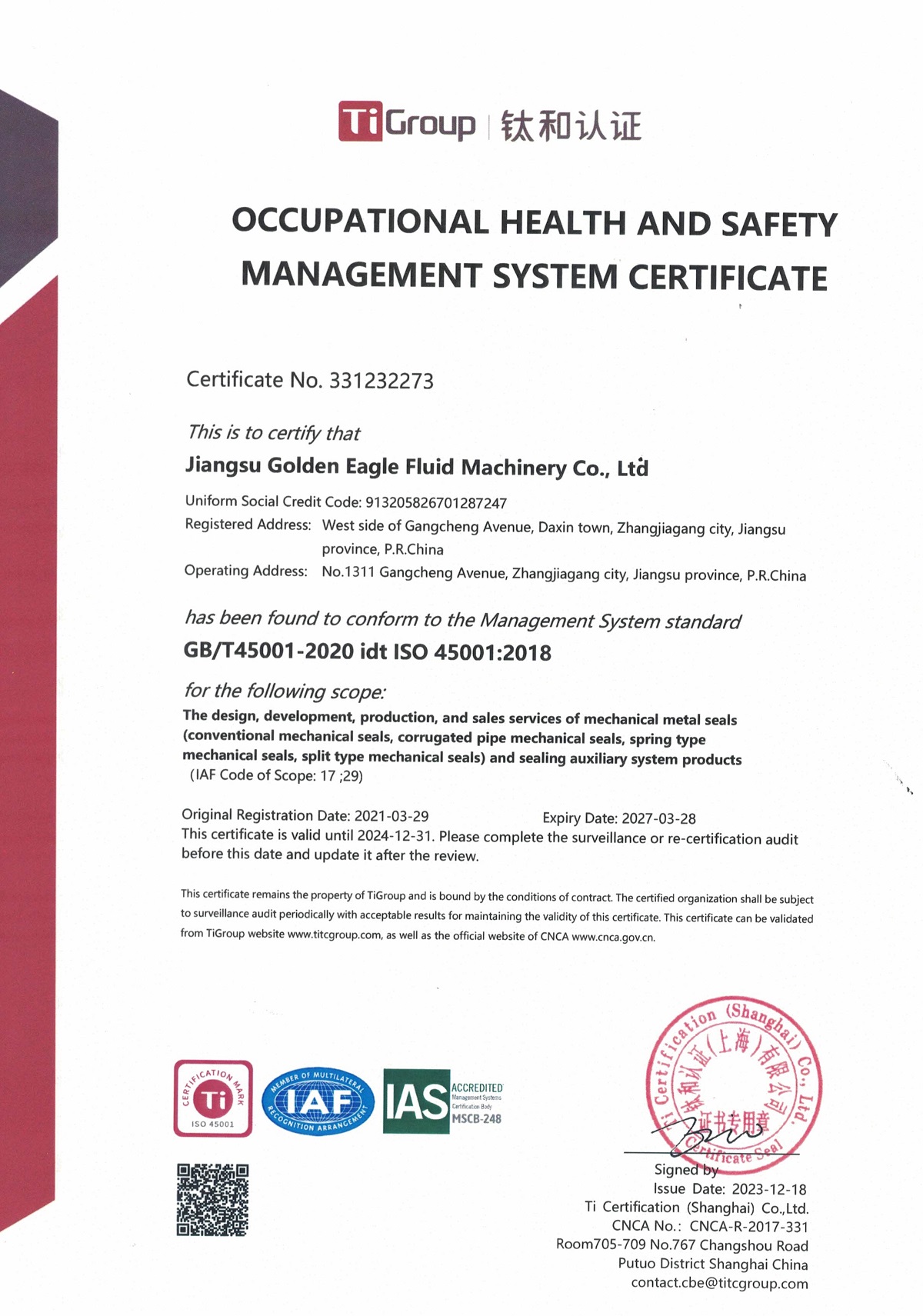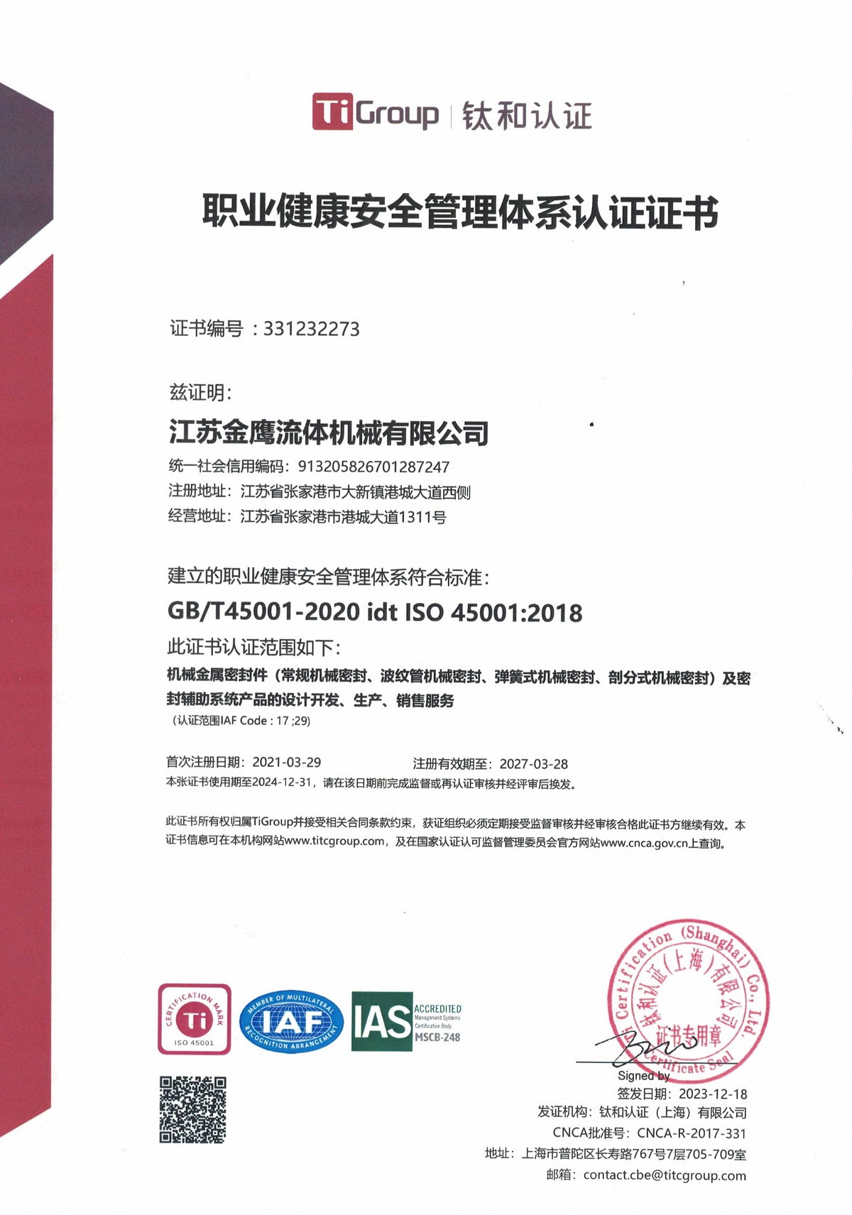 職業健康安全管理體系認證證書(中文版)