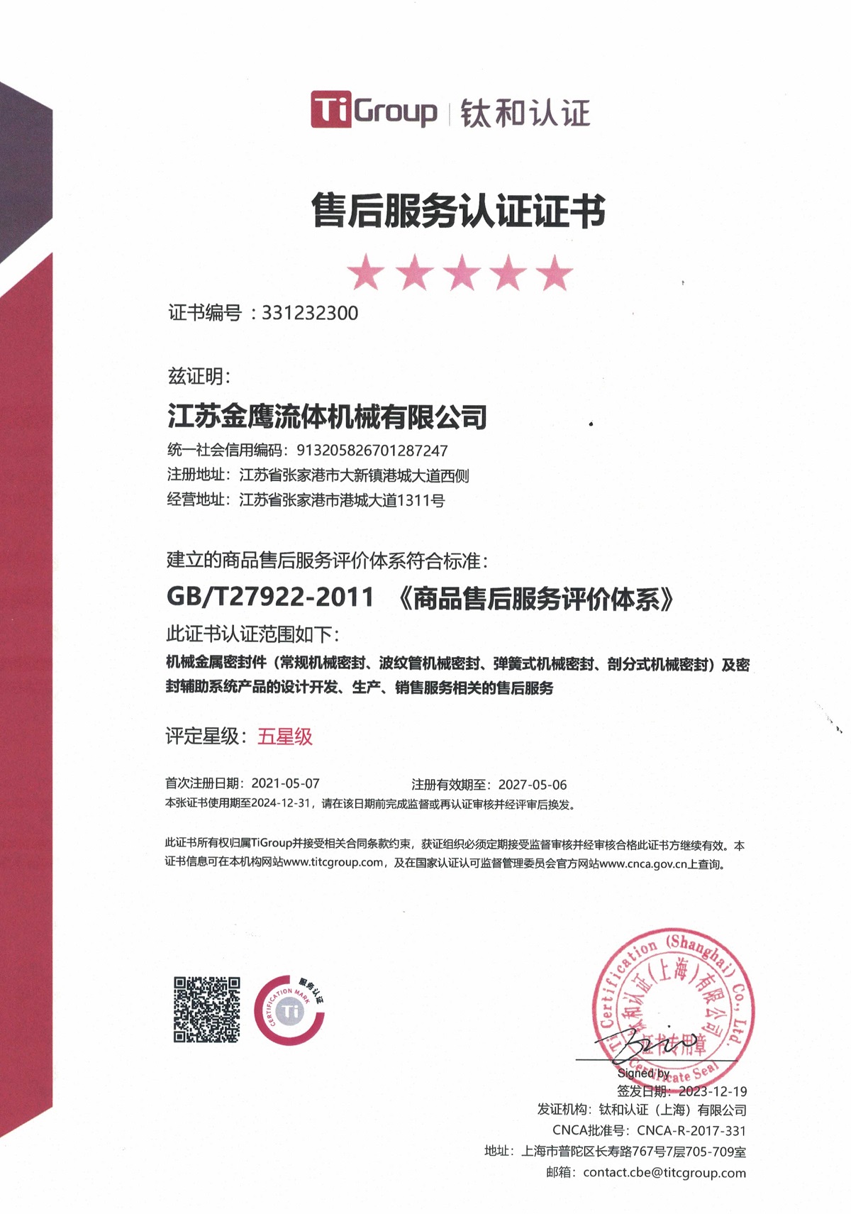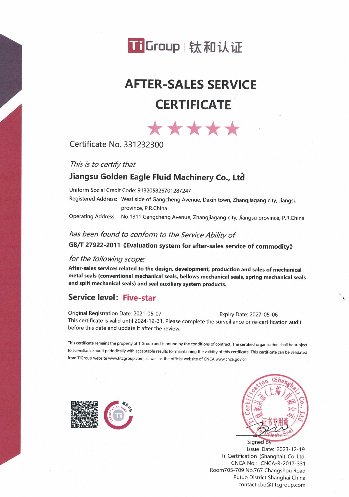 售后服務認證證書(中文版)