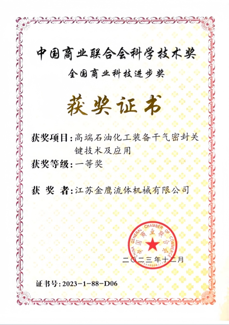 全國商業科技進步一等獎證書-金鷹流體